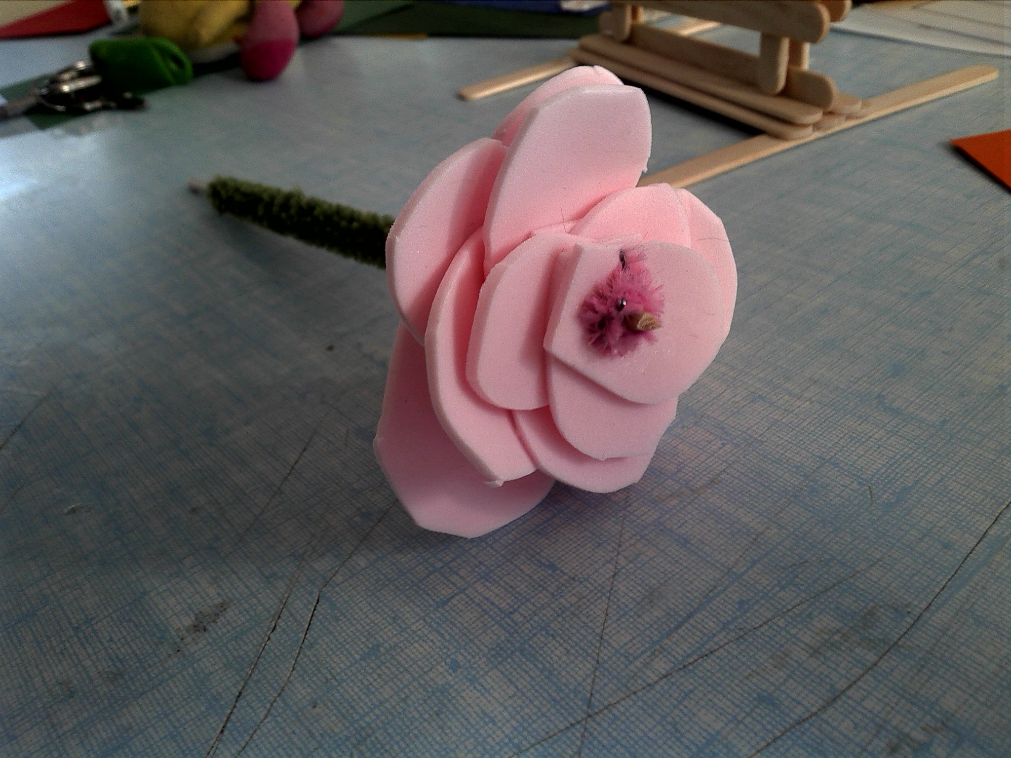 J'ai découpé des pétales dans du papier mousse ( de plus en plus petit) et je les ai planté dans un pic à brochette que jai recouvert avec un cure pipe vert.j'ai collé un cure pie au bout pour que les pétales ne se détache pas.