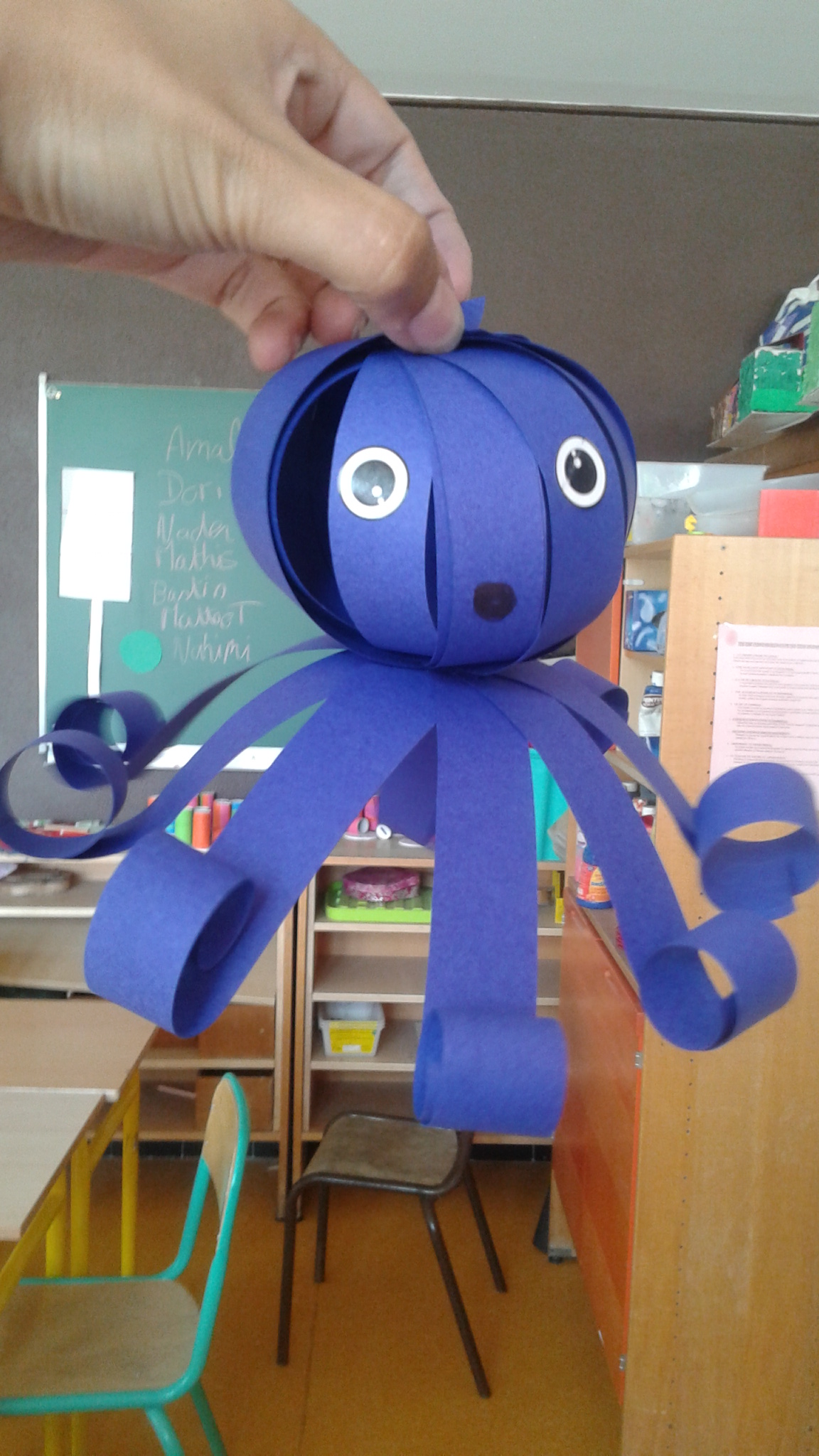 j'ai fait une douzaine de bandes, je les ai perforé aux extrémités et j'ai mis une attache parisienne au deux extrémités. J'ai déroulé le tout, j'ai ajouté les yeux la queue et les nageoires.