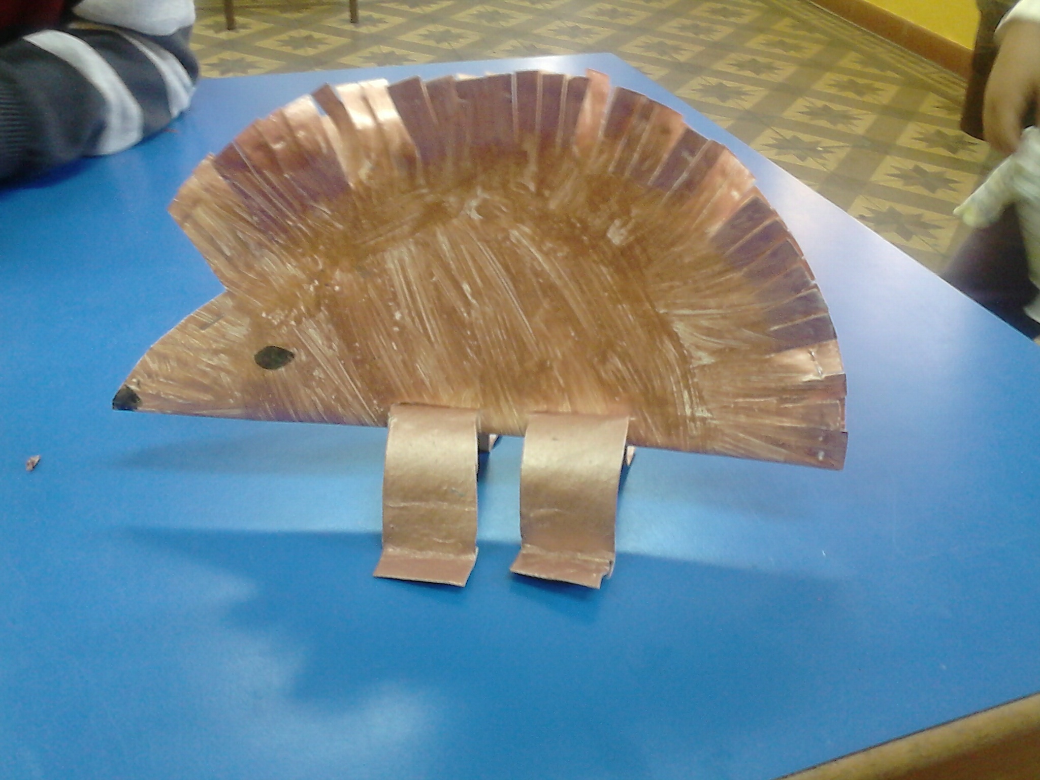 Fait avec une assiette en carton plier en deux et des rouleaux de papier toilette pour les jambes